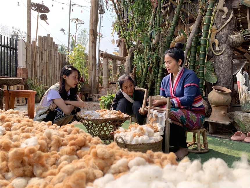 活動現(xiàn)場,她們親身體驗了老撾傳統(tǒng)手工編織技藝。在手藝人的指導下,從采摘棉花開始,逐步完成壓平、卷軸成絲線、編織成布等工序,感受老撾傳統(tǒng)工藝的精妙。